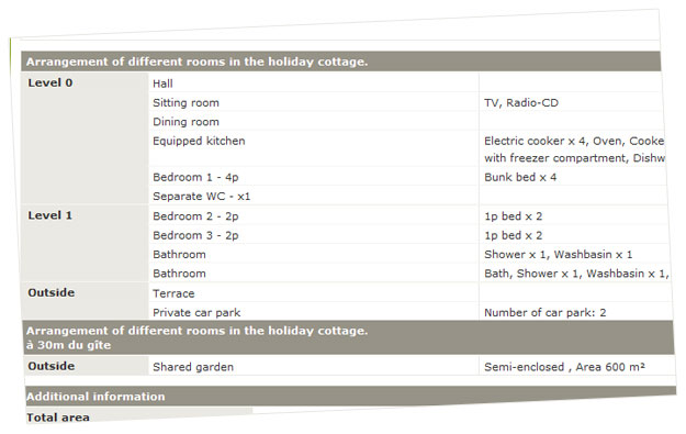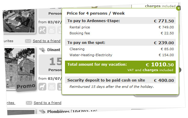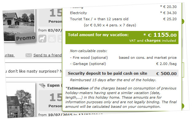 The rent, the handling charges, the usage costs, the taxes. All that needs to be paid is included in the price. We show you the total price. This means you do not need a calculator or Excel sheet in order to be able to know the pricetag of your holiday, neither for choosing the best price/quality ratio. Choosing your holiday home should be simple!