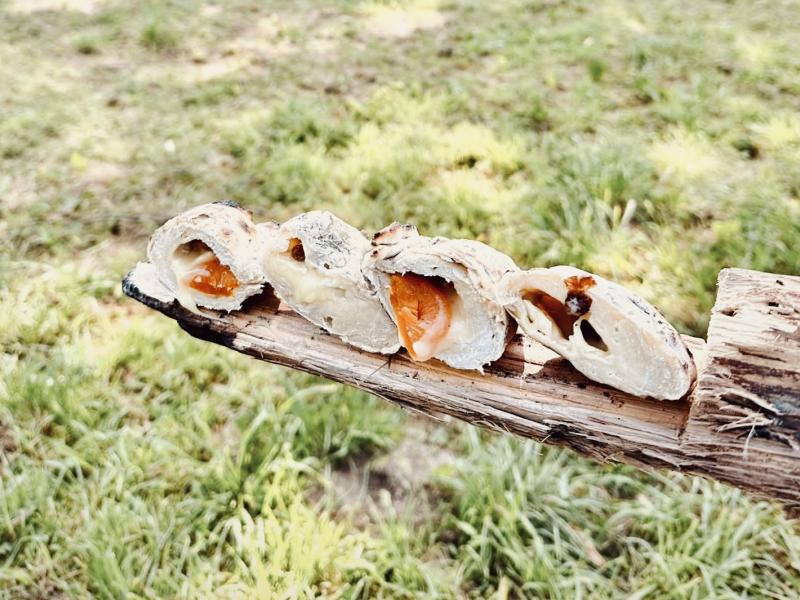 First, you'll kindle your campfire following Eric, your instructor's advice. Then, you'll prepare your dough with flour, salt, and water, adding your favorite ingredients: spices for an Italian flavor, raisins for those with a sweet tooth, or cheese and chorizo for the gourmet enthusiasts... Afterward, you'll bake your trapper's bread directly on the embers of our campfire.