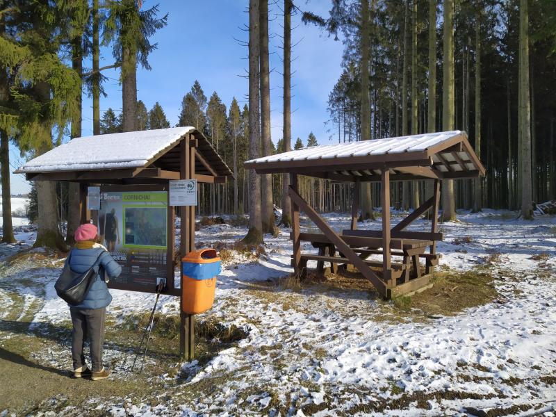 Cette longue promenade jouit d'un dénivelé modeste. Elle vous ravira par la diversité des paysage que vous allez y rencontrer. Au départ du Cornichai, vous partirez par le lieu-dit de la Croix Husson pour vous enfoncer dans la forêt et aborder par un chemin très herbacé le hameau de La Géripont. Après avoir longé son superbe étang, vous prendrez la direction d'un plus petit hameau encore : La Girgaine. Vous repartirez ensuite vers le lieu-dit "Le Steukion" où vous longerez un potager citoyen. Sur la fin de la promenade, un passage a été spécialement aménagé pour enjamber un tout petit ruisseau, c'est le seul endroit un peu "délicat" de cette riche promenade qui vous ramènera à bon port. Comptez trois heures pour de bons marcheurs, une heure de plus si vous aimez flâner. (source SI Bertrix)
