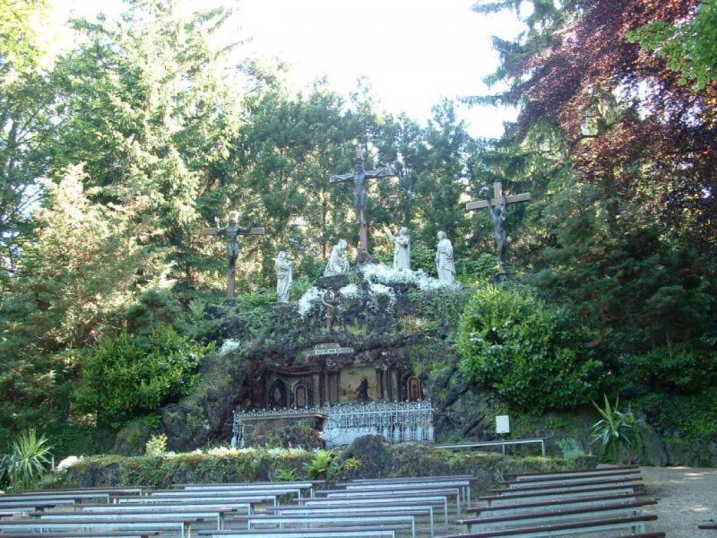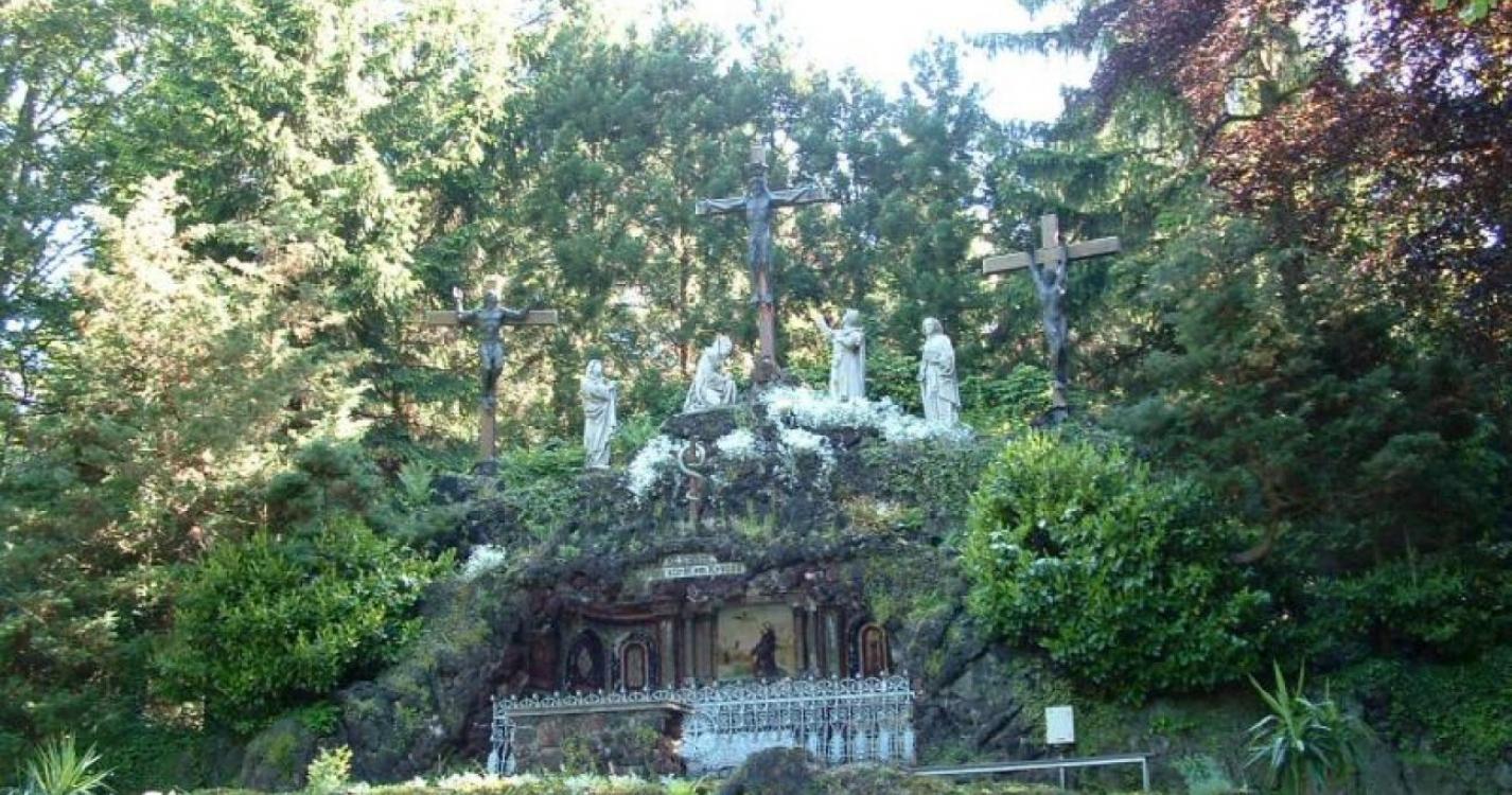 Tracé forestier débouchant sur le site marial de Moresnet-Chapelle et son calvaire monumental.