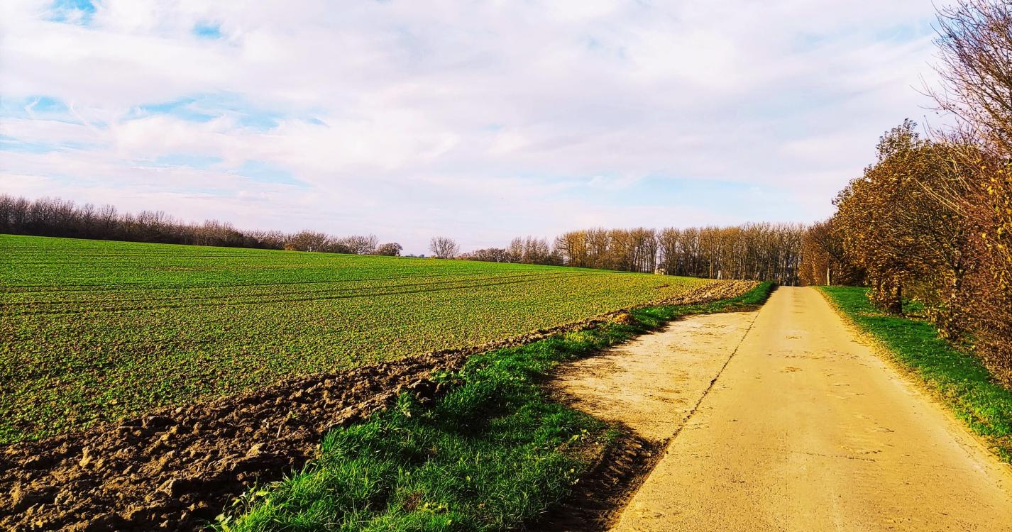 Cette promenade se fait en grande partie sur des petites routes en bitume, à travers champs et villages.