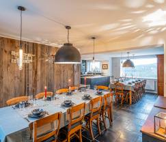 Genießen Sie wohlige Momente der Entspannung nach einem erlebnisreichen Tag an der frischen Luft im gemütlichen Wohnzimmer mit Fußboden aus regionalem Naturstein, einladendem Kaminofen, Fernseher und einer großen Glastür mit einem Panoramablick über die ländliche Umgebung, die einem Gemälde gleichkommt! Ihre leckeren Mahlzeiten in geselliger Runde teilen Sie im geräumigen und einladenden Esszimmer gleich neben der eleganten, sehr gut ausgestatteten Küche mit Vitroceranherd mit 4 Kochfeldern, Abzugshaube, Backofen, Mikrowelle, Kühlschrank, Geschirrspüler, Nespresso-Kaffeemaschine, Filterkaffeemaschine, elektrischem Wasserkocher, Toaster, Suppenmixer und Obstpresse. Außerdem verfügen Sie über eine Waschküche mit Waschmaschine, Kühlschrank mit Gefrierfach, Geschirrspüler und Staubsauger.