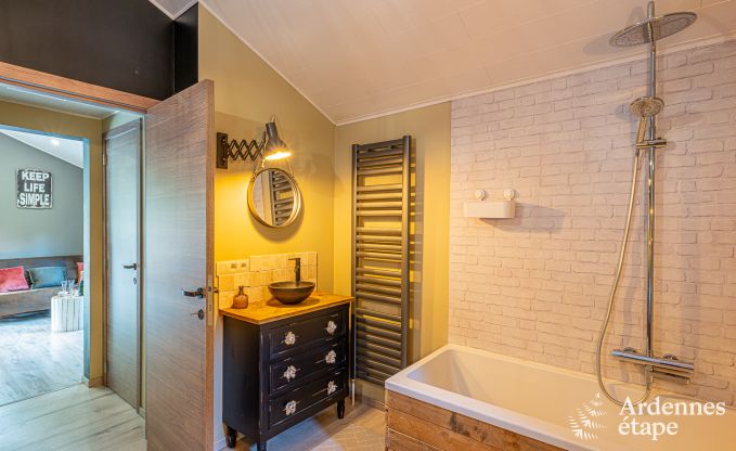 Dieses wunderbare, kleine Chalet mit Terrasse, Garten und Teich ist ideal für einen Urlaub zu zweit. Und Sie können zwei Hunde mitnehmen. Dieses Ferienhaus mit Charme erwartet Sie mit einem Schlafzimmer und einem Badezimmer . Ausgehend vom Wohnzimmer gelangen Sie über die große Glas-Schiebetür direkt in den großen Garten und auf die reizvolle Terrasse mit aufblasbarem Whirlpool und...