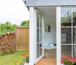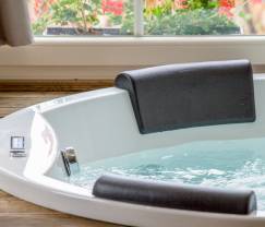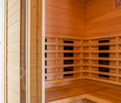 In diesem Ferienhaus ist alles in einem einzigen Raum zusammengefasst: Schlafzimmer mit Doppeldusche und Infrarotkabine, Sitzecke und etwas abseits die Küche mit einer Essecke. Das Tüpfelchen auf dem i bildet der Whirlpool mit Ausblick auf die Natur.