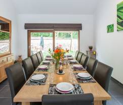 Ein Höchstmaß an Komfort für die ganze Familie: Das war das Ziel bei der Gestaltung dieses Ferienhauses. Hier werden sich alle schnell wie zu Hause fühlen. Für die Kinder gibt es einen eigenen Spieleraum, während die Erwachsenen sich nach einer schönen Wanderung auf wunderbare Momente der Entspannung im Wellnessbereich mit Sauna freuen dürfen. In diesem hochwertig ausgestatteten Chalet findet sich immer ein netter Zeitvertreib. Das gilt auch für den wunderschönen Außenbereich, wo Sie zusammen eine Runde Boule können, während die Kinder sich im privaten Garten mit Schaukel nach Herzenslust vergnügen. Auch in praktischer Hinsicht wurde an alles gedacht, um Ihnen einen angenehmen Aufenthalt zu bereiten. Sie verfügen über eine moderne und hervorragend ausgestattete Küche sowie über 5 Schlafzimmer, von denen drei mit einem eigenen Bad ausgestattet sind. Ein viertes Badezimmer ist im zweiten Stock gelegen. Im Erdgeschoss befindet sich der Hauptwohnbereich. Hier können Sie im Wohnzimmer gemütlich ein Gläschen zusammen trinken oder im einladenden Ambiente des Esszimmers ein schönes Essen in großer Runde genießen.