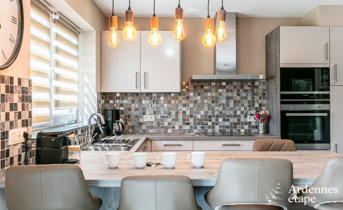 $µSich auf der Terrasse von der Sonne verwöhnen lassen, den Kindern beim Herumtollen im Garten zuschauen, sich im Whirlpool entspannen, sich bei einer Partie Kicker messen… So sollte ein Urlaub aussehen, nicht wahr? Ob mit der Familie oder mit Freunden, dieses geräumige Ferienhaus offenbart Ihnen alles, was den Reiz der Ardennen ausmacht. Entspannen Sie sich mit einem guten Buch, veranstalten Sie ein Dartturnier während des Aperitifs oder entscheiden Sie sich für einen geselligen Grillabend! Unser Tipp? Verwandeln Sie die traumhafte offene Küche mit Theke in ein Buffet. Eine einfache und zugleich gesellige Lösung!