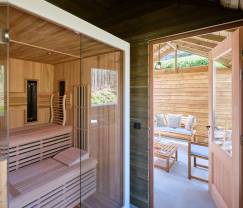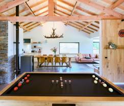 Zur Entspannung muss man das Ferienhaus nicht verlassen. Es gibt einen Holzpelletofen, der für eine gemütliche Atmosphäre sorgt, einen holzbeheizten Hot Tub, in dem man herrlich entspannen kann, und sogar eine Außensauna für ein wohltuendes Wellnesserlebnis. Innen findet man auch eine Bar und einen Entspannungsraum mit Billard und Darts, ideal, um gemeinsam Spaß zu haben. Für Sportliche ist eine überdachte Fahrradgarage vorhanden. Draußen findet ihr auch ein Pétanque-Feld mit Terrasse, das auf das Tal blickt.