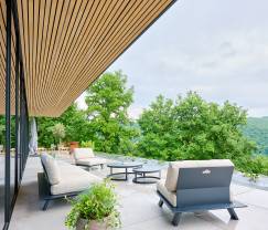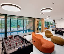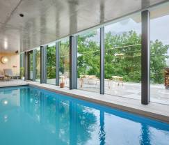 Ein absolutes Highlight dieser Luxusvilla ist der Innenpool mit großen Panoramafenstern rundherum, direkt verbunden mit einer Panoramaterrasse. Hier können Sie angenehm schwimmen und dabei den Blick auf das Tal und die Wälder genießen. Nach dem Baden können Sie Ihre Entspannung mit einer Sauna-Sitzung verlängern und bequem die Gartenmöbel auf der überdachten Terrasse nutzen. Das Haus verfügt außerdem über einen Ofyr-Grill, perfekt für gesellige Grillabende am Feuer.