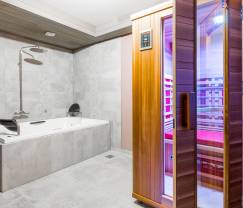 Eine zusätzliche Dusche gibt es im Wellnessbereich. Dort finden Sie auch eine Infrarotkabine, einen Whirlpool sowie 2 Liegestühle zum Relaxen. Ein Bereich, in dem man so richtig entspannen kann, zur größten Freude aller.
