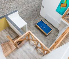 Im obersten Stockwerk finden Sie eine zweite Sitzgruppe auf einem Mezzanin. Die Jugendlichen können sich hier zu einem Gesellschaftsspiel zurückziehen, oder um auf ihren Tablets zu surfen, denn es gibt im ganzen Haus kostenlos WLAN.