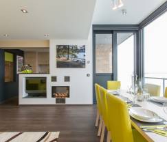Vom Wohnzimmer und der geschützten Terrasse genießen Sie eine ungehinderte Aussicht auf den See, ganz gleich zu welcher Jahreszeit.