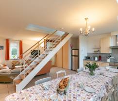 Dieses Ferienhaus besteht eigentlich aus zwei Häusern, die über das Esszimmer miteinander verbunden sind. Sie verfügen hier über 6 Schlafzimmer und 4 Badezimmer, ideal für große Gruppen oder mehrere Familien. Für die jüngsten Gäste stehen 2 Babybetten und 2 Kinderstühle zur Verfügung, ebenso wie ein Wickelkissen.