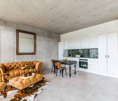 Innen gestalten sich Beton und Holz zu einem sehr trendigen und einladenden Ambiente.