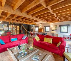 Der Wohnbereich dieser Luxusvilla wurde im Hinblick auf maximalen Tageslichteinfall konzipiert. Das große Wohnzimmer (mit Fernseher, DVD-Player und Internet) ist daher zum Esszimmer und der voll ausgestatteten Küche hin offen. In der Küche verfügen Sie über einen Herd mit Ceranfeld, eine Kombimikrowelle, einen Kühlschrank und eine Spülmaschine. Die sanitären Einrichtungen (2 Badezimmer und ein separates WC) sowie eines der 3 Schlafzimmer befinden sich im Erdgeschoss. Die übrigen Schlafzimmer liegen im Obergeschoss. Dort gibt es auch ein Mezzanin mit Schlafcouch. Somit bietet diese Luxusvilla genügend Platz für 9 Feriengäste, die hier optimale Privatsphäre genießen. Auf der überdachten Terrasse mit Blick auf die Region können Sie an lauen Sommerabenden noch lange draußen sitzen und plaudern. Vielleicht haben Sie auch Lust auf ein schönes Barbecue? Die Kinder können sich unterdessen im großen Garten nach Herzenslust vergnügen.