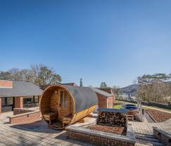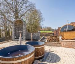 Dieses ehemalige Internat wurde auf den Grundfesten eines alten Schlosses erbaut, auf einem Hügel über dem Tal der Maas und den an den Ufern emporragenden Felswänden. Im Jahr 2023 wurde alles geschmackvoll und fachmännisch renoviert. In den verschiedenen Gebäuden hat jeder genügend Raum für sich, denn es gibt 8 Ferienwohnungen mit jeweils eigener Küche, Schlafzimmern und Bad. Die einzelnen Unterkünfte sind um ein riesiges Gemeinschaftsgebäude herum angeordnet, wo es eine große Gemeinschaftsküche und einen Speisesaal, einen Kinoraum, einen Partyraum, ein Wohnzimmer, einen Hobbyraum mit Darts, Billard, Tischtennis und Kicker und einen großen Leseraum gibt. Somit können die Mitglieder Ihrer Reisegruppe verschiedensten Gemeinschaftsaktivitäten nachgehen, sich bei Bedarf aber auch in die Privatsphäre der eigenen Wohnung zurückziehen. Die ideale Kombination für einen Aufenthalt mit einer großen Gruppe. Der Komplex liegt in einem 14 Hektar großen Park mit einem Spielplatz, auf dem die Kinder nach Herzenslust herumtollen können. Die Erwachsenen wiederum werden die Sauna und die holzbeheizten Hot Tubs auf den verschiedenen Terrassen genießen. Der gesamte Komplex eignet sich außerdem hervorragend für Menschen mit eingeschränkter Mobilität, da sich sämtliche Einrichtungen im Erdgeschoss befinden.