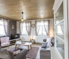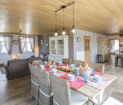 Der Wohnbereich mit Wohn- und Esszimmer punktet mit seiner gemütlichen und zugleich modernen Atmosphäre. Durch die großen Glastüren können Sie von hier aus auch die Kinder im Auge behalten, während diese sich im Garten vergnügen. Der Garten ist zudem rundum eingezäunt und bietet Ihnen freie Sicht auf die umliegende Landschaft und das Weideland der Hauseigentümer.