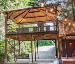 Die große überdachte Terrasse ist besonders angenehm: Man fühlt sich wie in einer Baumhütte, die gleichzeitig sehr komfortabel ist. Da sie beheizt und beleuchtet ist, kann man sie zu jeder Jahreszeit genießen. Ein Erlebnis, das man sich nicht entgehen lassen sollte!