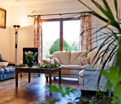 Wohn- und Esszimmer sind gemütlich eingerichtet, und auf den Sofas sowie am Esstisch ist Platz für alle. Im Wohnzimmer gibt es einen Fernseher mit Kabel-TV, ein Radio mit CD-Spieler, einen DVD-Player und WLAN.