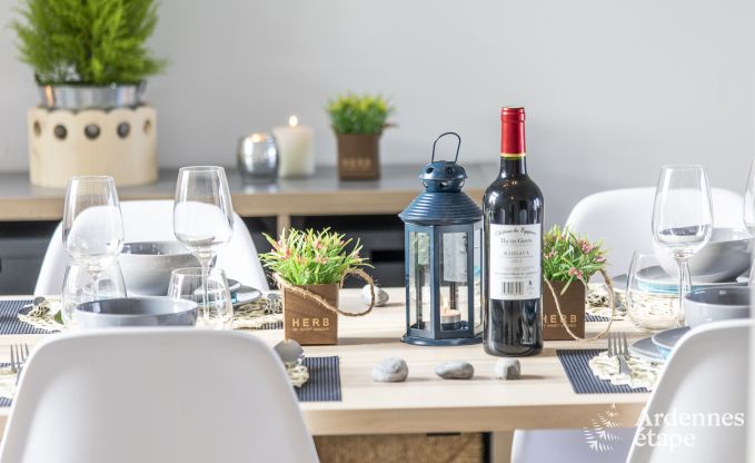 Dieses 3-Sterne-Dorfhaus liegt in einem Vorort von Durbuy, inmitten der malerischen Ardennen. Seine eindrucksvolle, überhängende Veranda eröffnet Ihnen den Blick auf die Wälder, die blühenden Wiesenteppiche der Täler und das Dorf, das Sie in nur wenigen Minuten zu Fuß erreichen. Dieses Ferienhaus bietet Platz für 6 Personen. Mit einer Fläche von 130 m² ist es auf 2 Geschosse verteilt. Im Erdgeschoss finden Sie die Eingangshalle, das Esszimmer, eine moderne, komplett ausgestattete Küche, das Wohnzimmer mit Schlafsofa für eine Person und die Veranda. Im Obergeschoss erwarten Sie 2 Schlafzimmer, davon eines mit Doppelbett und das zweite mit drei Einzelbetten. Darüber hinaus verfügen Sie über ein Badezimmer und eine separate Toilette. Für angenehme Momente der Entspannung sorgt der Wellnessbereich mit Infrarotsauna, Duschkabine und Hammam. Dieses Ferienhaus bietet Ihnen viel Tageslicht und Komfort mit einer Einrichtung, die Tradition und Moderne harmonisch miteinander kombiniert. Sie verfügen über einen 100 m² großen, nicht umzäunten, privaten Garten und einen kleinen Parkplatz auf der anderen Seite einer wenig befahrenen Straße.