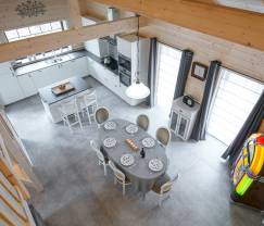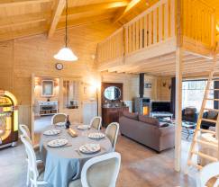 Der vollkommen aus Holz gestaltete, rustikale Stil verleiht dem Haus eine einladende Atmosphäre, die einem Chalet im Hochgebirge würdig sind! Der offene Wohnbereich mit viel Tageslicht besteht aus einem Esszimmer mit Vintage-Jukebox, die Sie nach Belieben nutzen können, um zu jeder Tageszeit eine angenehme Hintergrundmusik ertönen zu lassen. Machen Sie es sich im Wohnzimmer am Kaminofen gemütlich, oder gönnen Sie sich einen Moment der Entspannung in der Infrarotsauna. Das Chalet beherbergt 3 Schlafzimmer mit Doppelbett, davon eines mit privatem Badezimmer. Die 20 m² große, überdachte Terrasse ist überaus reizvoll und lädt Sie dazu ein, die Außenbereiche in aller Gelassenheit auf sich wirken zu lassen, während sich die anderen bei einer Partie Boule im Garten die Zeit vertreiben. Darüber hinaus stehen Ihnen ein privater Parkplatz mit 3 Stellplätzen und Babyausstattung zur Verfügung.