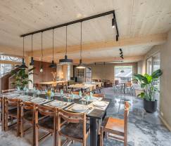 Ihre Gruppe kann sich in dem großen Speisesaal neben der professionellen offenen Küche mit ihrer großen Theke, die ideal für Frühstücksbuffets ist, bequem entspannen. Für diejenigen, die hier geschäftlich übernachten möchten, gibt es einen Projektionsraum. Es gibt verschiedene Lounge- und Entspannungsbereiche, darunter einer mit einem Gaskamin. Also genug Platz für eine wohlverdiente Ruhe nach den Radanstrengungen.