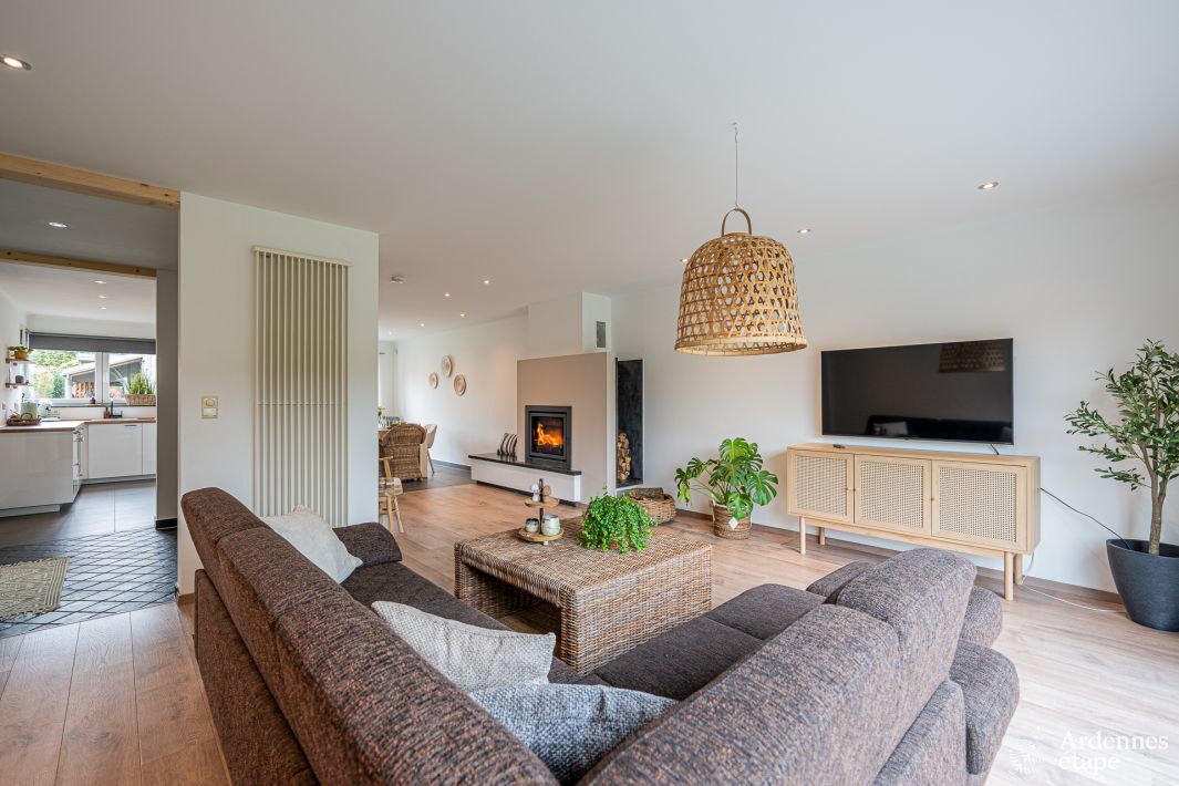 Das Haus liegt in einer ruhigen, grünen Wohngegend, ganz in der Nähe des Zentrums von Eupen, wo Sie zahlreiche Geschäfte und Restaurants finden. Die Unterkunft wurde 2025 komplett renoviert und elegant mit sanften, natürlichen Tönen und vielen Pflanzen eingerichtet, was für eine gemütliche und harmonische Atmosphäre sorgt. Die geräumige und helle Unterkunft verfügt über eine wunderschöne große Küche mit einer zentralen Insel und einer gemütlichen Bar-Ecke, wo Sie gemeinsam ein Getränk oder eine Mahlzeit genießen können. Die Sitzecke mit einem Kassettenofen und die separate TV-Ecke mit einem bequemen Sofa machen Ihren Aufenthalt noch angenehmer.