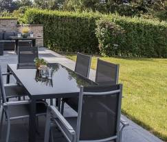 Durch die Glastür haben Sie direkten Zugang zur Privatterrasse und zum Privatgarten, wo Sie die frische Luft, einen Grill und die Gartenmöbel genießen können.