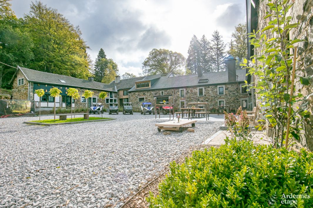 Verbringen Sie Ihren Urlaub in Francorchamps in einer idyllischen Umgebung. Das ehemalige Bauernhaus zeichnet sich durch seine schnörkellose, aber elegante Architektur aus. Diese Raffinesse setzt sich auch in den Innenbereichen fort. Moderne Einrichtungsobjekte, wie die Lampen, unterstreichen den rustikalen Stil. Die Holzvertäfelungen verleihen den Räumen eine besondere Gemütlichkeit. Dieses Naturmaterial schafft zudem eine überaus einladende Atmosphäre. Das 900 m² große Ferienhaus ist auf 2 Geschosse verteilt. Im Erdgeschoss verfügen Sie über ein Wohnzimmer mit offenem Kamin, Bar und Bierzapfanlage. Gleich nebenan gelangen Sie in ein großes Esszimmer und in die ausgestattete Küche. Auch das Spielzimmer mit Billardtisch befindet sich auf diesem Geschoss. Dieses außergewöhnliche Ferienhaus bietet viel Platz für 37 Personen. Darüber hinaus umfasst es 12 Schlafzimmer, von denen alle mit privatem Badezimmer ausgestattet sind. Das größte Schlafzimmer ist im Erdgeschoss eingerichtet, während Sie die anderen Schlafzimmer im ersten Geschoss erwarten. Dieses große Reihenhaus öffnet sich hin zu einer 200 m² großen, privaten Terrasse und einem nicht umzäunten, 4000 m² großen Gemeinschaftsgarten.