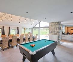 Einer der größten Vorteile dieses Ferienhauses ist das Hallenbad. Unabhängig vom Wetter kann man also immer einen Sprung ins Wasser machen. Draußen gibt es einen großen privaten Garten mit einer Schaukel und einer Rutsche. Für die Spielfreudigen gibt es ein Boule-Feld und einen Billardtisch. Das Spielzimmer bietet zusätzliche Unterhaltung mit einem Airhockey-Tisch und anderen Spielen.