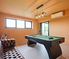 Zur Entspannung und Unterhaltung bietet die Villa einen Entspannungsraum mit einer Infrarotkabine und einer italienischen Dusche. Es gibt auch ein Spielzimmer mit einem Billardtisch und einer Bar. Der privater Garten und die Terrasse mit Aussicht sind ideal für Aktivitäten im Freien und Grillabende. Die Villa ist auch hundefreundlich, also darf Ihr Hund mitkommen.