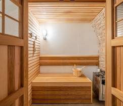 Draußen finden Sie einen wunderschönen privaten Garten mit einem Grill. Es gibt auch eine private Terrasse, auf der Sie die Aussicht genießen können. Für diejenigen, die sich entspannen möchten, gibt es einen Entspannungsbereich mit einer Sauna. Und für diejenigen, die etwas Energie loswerden möchten, gibt es einen Spielraum mit einem Kicker.