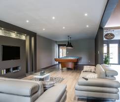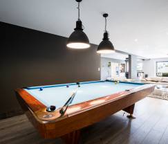 Im Erdgeschoss bildet der große Gemeinschaftsbereich mit Küche, Esszimmer und Wohnzimmer den idealen Rahmen für ein leckeres, gemeinsames Essen, dass Sie alle zusammen zubereiten können. Sie können sich auch im Wohnzimmer entspannen oder ein Billardturnier organisieren.