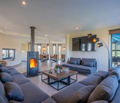 Die Villa hat ein modernes, luxuriöses Aussehen und ist stilvoll eingerichtet. Der Holzofen sorgt für eine gemütliche Atmosphäre und Wärme an kälteren Tagen. Draußen finden Sie einen Grill, perfekt für einen gemütlichen Abend mit leckerem Essen. Darüber hinaus gibt es einen Privatgarten, in dem Sie die Ruhe und die Natur genießen können. Die überdachte Terrasse ist der ideale Ort, um sich mit einem guten Buch oder einem Glas Wein zu entspannen.