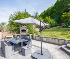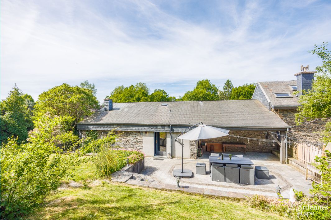 Geschmackvoll eingerichtetes Ferienhaus aus ardennischem Naturstein mit bewaldetem Garten mit Wasserstelle, großer Terrasse und wo Ihr Hund willkommen ist.