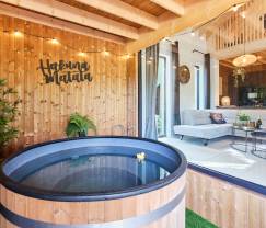 Die Ausstattung des Chalets ist wirklich beeindruckend. Man kann herrlich entspannen im Schwimmbad-Spa, einer einzigartigen Kombination aus Schwimmbad und Jacuzzi, wo man Bahnen ziehen und gleichzeitig das warme Wasser und die Blasen genießen kann. Außerdem gibt es einen hölzernen Hot Tub, in dem man mit der ganzen Gesellschaft unter dem Sternenhimmel relaxen kann. Für zusätzlichen Wellness-Spaß ist auch eine Außensauna vorhanden.