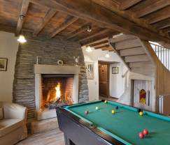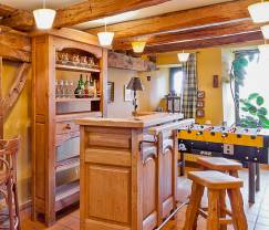 Und das ist noch nicht alles! Ihr Ferienhaus erwartet Sie mit sage und schreibe 3 gemütlichen Wohnzimmern und einem separaten Fernsehraum. Erfreuen Sie sich einer angenehmen Lektüre am knisternden Kaminfeuer, amüsieren Sie sich bei einer Partie Billard, oder genießen Sie einen Abend im Unterhaltungsraum mit Bar, Tischkicker, Dartscheibe und Palets-Spiel. Besonders die jüngeren Gäste werden begeistert sein! Das geräumige Esszimmer mit Platz für 24 Personen liegt gleich neben der voll ausgestatteten Küche mit 4-flammigem Gasherd, Backofen, Mikrowelle und zwei Geschirrspülern.
