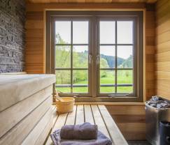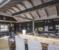 Der Außenbereich hat noch weitere angenehme Überraschungen in petto. Sie können nach einer langen Wanderung eine Pause gebrauchen? 2 Whirlpools, eine Sauna mit Panoramablick und eine Infrarotkabine stehen für Sie bereit. Was aber wirklich einzigartig ist, ist die als Poolhaus eingerichtete Hütte mit Wohnzimmer, Küche und Außen-Essbereich. Was für ein Luxus!