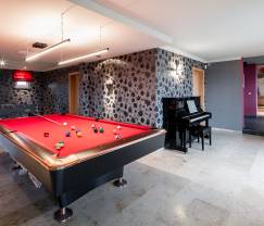Bereit für einen idyllischen Urlaub? Diese prachtvolle Luxusvilla für 12/13 Personen lässt wirklich keine Wünsche offen! Entspannen Sie sich im Indoorpool mit Blick auf den Garten, und genießen Sie die wohltuende Massage des Whirlpools oder die entspannende Wärme der Sauna und der Infrarotsauna. Auf dem Programm stehen Erholung, Abschalten, Ruhe und Unterhaltung für Klein und Groß. Im Sommer werden Sie sich am liebsten auf der Terrasse und im Garten aufhalten und den Panoramablick über die ländliche Umgebung auf sich wirken lassen. Und dann? Wie wär‘s mit einer Partie Boule zum Apéritif? Im Winter schlüpfen Sie nach entspannenden Momenten im Wellnessbereich in Ihre Hausschuhe und öffnen Ihr Lieblingsbuch am Kaminofen im Wohnzimmer.