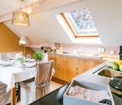 Der Eingang des Ferienhauses liegt im Erdgeschoss, aber die Wohnräume befinden sich im ersten Geschoss. Sie gelangen über eine Wendeltreppe in das Obergeschoss.