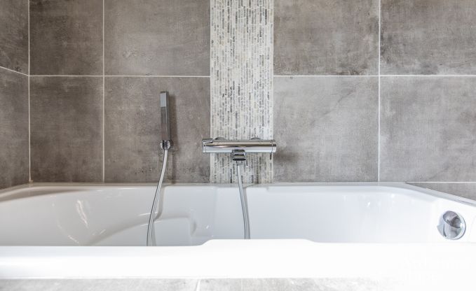 Prima op de kapotte bank en het kapotte plafond in de badkamer na