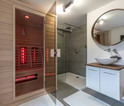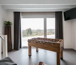 Dieses Haus mit drei Fassaden liegt auf dem Land in der Provinz Luxemburg und ist für familiäre Gruppen gedacht. Mit seiner modernen, eleganten Inneneinrichtung bietet es ein heimeliges Ambiente. Die traditionellen Baustoffe sorgen wiederum für einen rustikalen Touch. Dieses große Ferienhaus mit 200 m² Wohnfläche auf drei Stockwerken ist für 6-8 Personen geeignet. Das Erdgeschoss ist auf Kurzweil ausgerichtet. Dafür sorgt unter anderem das Spielzimmer für die Kids. Zudem befindet sich hier der Gemeinschaftsbereich mit Esszimmer und Einbauküche. Das Wohnzimmer befindet sich im ersten Obergeschoss und bietet somit Ruhe und Privatsphäre. Die komfortablen Designmöbel sorgen für ein geselliges Ambiente. In diesem Stockwerk befinden sich auch zwei große Zimmer und zwei Badezimmer. Die Infrarotkabine in einem der beiden Badezimmer sorgt zudem für noch mehr Wohlbefinden. Das zweite Obergeschoss umfasst ein schlicht eingerichtetes Zimmer unter dem Dach sowie eine Polstersitzgruppe auf dem Mezzanin, die sich nötigenfalls auch zum Schlafen eignet. Zu alledem verfügt dieses einzigartige Ferienhaus über eine überdachte, 40 m² große Terrasse mit Jacuzzi für sechs Personen. Genießen Sie den Blick direkt auf eine 80 m² großen Garten, in dem Sie die Kinder unbesorgt spielen lassen können.