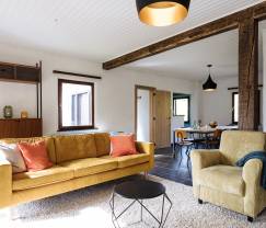 Sie werden sofort begeistert sein von der Umgebung dieses reizvollen Anwesens mit traumhaftem Blick in einer ruhigen Gegend. Der Garten wurde liebevoll gestaltet, um Ihnen einen möglichst erholsamen Aufenthalt zu bereiten. Entspannen Sie sich in der Garten-Sitzecke, während sich die Kinder auf dem 1000 m² großen Grundstück nach Herzenslust austoben. Auf der Terrasse können sich im Sommer alle zu gemütlichen Abenden am Grill zusammenfinden. Die Innenbereiche sind gleichermaßen gemütlich gestaltet und bieten insbesondere einen Wohnbereich mit ursprünglicher und geselliger Atmosphäre sowie eine Wohn- und Leseecke mit Bibliothek und Bar. Im Wohnzimmer können Sie es sich im Winter am Kaminofen gemütlich machen, und das Esszimmer lädt zu gemeinsamen Mahlzeiten in froher Runde ein. Die Küche ist umfassend ausgestattet, damit Ihnen die Zubereitung Ihrer Rezepte für die ganze Familie gelingt. Auf den ersten beiden Geschossen verfügen Sie über jeweils 3 Schlafzimmer und 1 Badezimmer, und im dritten Geschoss erwartet Sie ein 7. Schlafzimmer. Darüber hinaus gibt es im Zwischengeschoss der ersten Etage einen Mehrzweckraum mit verschiedenen Gesellschaftsspielen für die Kinder.