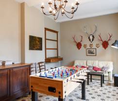 Von dieser wunderschönen und geräumigen Unterkunft, die durch ihre unwiderstehliche Authentizität und Atmosphäre besticht, werden Sie sofort begeistert sein. Das Interieur wird dem Charme des Gebäudes absolut gerecht, denn die geschmackvolle Raumdekoration und das schöne Mobiliar verleihen der Wohnung ein bemerkenswertes Flair. Mit einer Wohnfläche von 450 m² bietet die Unterkunft sehr viel Platz und eignet sich mit 6 Schlafzimmern und 4 Badezimmern besonders gut für einen Gruppenaufenthalt. In diesem großzügigen Ambiente werden sich alle Gäste sofort wohlfühlen. Sie verfügen über ein großes Wohnzimmer mit Kamin, in dem es sich wunderbar entspannen lässt, einen Hobbyraum für die Kinder sowie ein geräumiges Esszimmer für Mahlzeiten in geselliger Familienrunde. Die Küche ist ebenfalls sehr geräumig und lässt mit ihrer hervorragenden Ausstattung die Herzen aller Hobbyköche höherschlagen. Bei schönem Wetter können Sie es sich draußen im Garten, vollständig abgeschlossen, gemütlich machen. Hier gibt es eine Schaukel und eine Rutsche sowie eine hübsche Terrasse mit Holzkohlegrill.