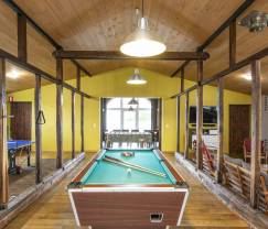 Dieses komplett renovierte Ferienhaus ist Teil eines großen Bauernhofs. Hier finden Sie Komfort, Ruhe und absolute Entspannung. Jedes Zimmer verfügt über ein eigenes Badezimmer, sodass Sie während Ihres Gruppenaufenthalts dennoch die nötige Privatsphäre genießen. Im Wellnessbereich, der mit einer Sauna und Liegestühlen auf Sie wartet, können Sie so richtig die Seele baumeln lassen. Während Sie entspannen, dürfen die Kleinen (oder auch die Großen) sich im Hobbyraum mit Billardtisch, Tischtennisplatte, Kicker und Videospielautomat verausgaben. All das gibt es hier! Und noch dazu allerlei Kinderspielgeräte im Garten.