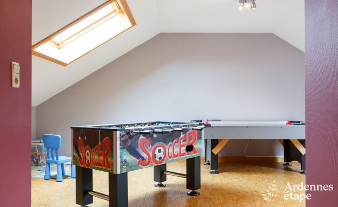 In diesem weitläufigen Ferienhaus mit 3 geräumigen und komfortablen Schlafzimmern finden 12 Personenoptimale Bedingungen für ihren Aufenthalt vor. Zwei der Schlafzimmer verfügen über ein eigenes Bad und ein drittes Badezimmer befindet sich im Obergeschoss. Für die Kinder gibt es ein Spielzimmer im 2. Stock, u. a. mit einem Tischkicker und einer TV-/DVD-Ecke. Diese besonders gut ausgestattete Unterkunft verfügt auch über einen Entspannungsbereich mit Sauna und Whirlpool. Hier kann sich schnell nach Lust und Laune entfalten, und wenn die ganze Familie zusammenkommt, ist der große Wohnraum im Erdgeschoss mit seiner gemütlichen Atmosphäre ideal. Der Steinkamin ist wunderschön und verspricht im Winter gemütliche Abende am Feuer. Die Küche ist sehr umfangreich ausgestattet. Sie finden dort unter anderem ein Raclette-Gerät, um Ihren Mahlzeiten im Kreise der Familie eine besondere Note zu verleihen. Im Sommer wird sicherlich der Grill zum Einsatz kommen, während sich die Kinder auf der Rutsche und dem Trampolin vergnügen werden.