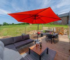 Der Außenbereich ist sogar größer als die Wohnfläche und wird die Kinder zweifellos erfreuen. Sie können einen Privatgarten mit verschiedenen Außenspielgeräten wie einer Schaukel, einer Rutsche und einem Trampolin genießen. Zur Entspannung gibt es einen hölzernen Hot Tub, in dem Sie nach einem abenteuerlichen Tag herrlich blubbern können. Außerdem gibt es eine gemütliche Privatterrasse mit wunderschöner Aussicht, komfortable Gartenmöbel und einen Grill, um gemeinsam schmackhafte Mahlzeiten zuzubereiten.