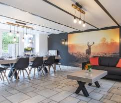 Dieses schöne, moderne Ferienhaus mit einer zeitgemäßen Inneneinrichtung wird Sie mit seinem Designambiente ganz einfach begeistern. Besonders schön ist das geräumige Wohnzimmer, wo Sie sich durch das riesige Gemälde, das einen majestätischen Hirsch darstellt, sofort in mitten in die Ardennen versetzt fühlen. Dieser große, offen gestaltete Raum ist mit seinem Kaminofen, der hübschen Bar-Ecke und dem tollen Licht bestens für ein Beisammensein geeignet. Die einzelnen Schlafzimmer lassen sich durch die individuelle Farbgestaltung leicht unterscheiden. Die 3-Sterne-Badezimmer sind einfach nur wunderschön...