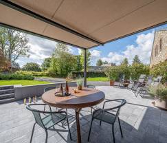 Das Haus verfügt über eine private Terrasse mit einer überdachten Pergola, die Sie öffnen oder schließen können, sodass Sie das Leben im Freien bei jedem Wetter genießen können. Außerdem gibt es einen kleinen, gepflegten Garten mit bunten Blumen, in dem Sie in aller Ruhe entspannen können. Die Gartenmöbel laden dazu ein, draußen zu essen oder einfach die frische Luft zu genießen. Für gemütliche Abende steht ein Grill zur Verfügung, perfekt, um gemeinsam zu kochen und die Abendsonne zu genießen.