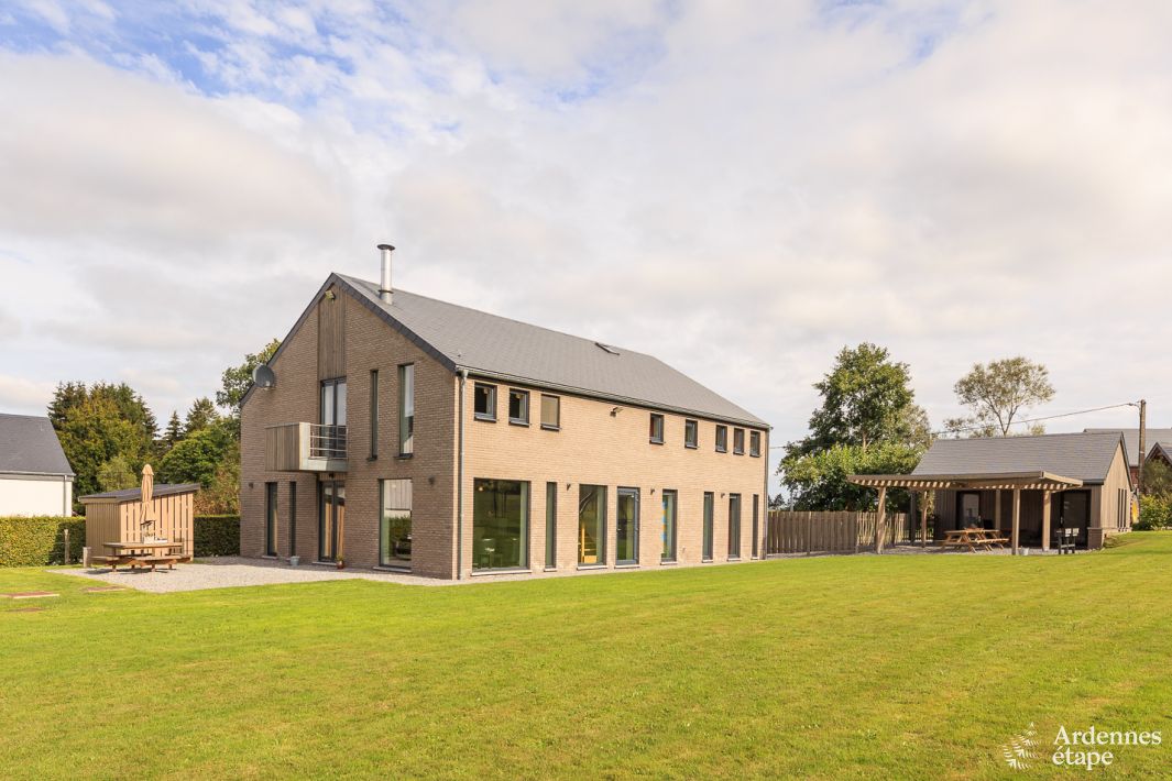 Dieses große Anwesen im belgischen Stil befindet sich 6 km von Manhay entfernt, in der Provinz Luxemburg und ist ganz auf Familiengruppen ausgerichtet. Das perfekt eingerichtete Haus ist zweigeschossig und empfängt seine Gäste in weitläufigen Räumen. Das Erdgeschoss des Ferienhauses lädt zu schönen gemeinsamen Momenten ein, insbesondere der Wellnessraum mit Hometrainer, Fernseher und Infrarotsauna für vier Personen, aber auch die schöne, moderne Einbauküche, die mit allen notwendigen Accessoires ausgestattet ist. An dem großen Esstisch hat die ganze Familie Platz. Ein Holzofen trägt zur gemütlichen und einladenden Einrichtung dieses großen Raums bei. Ebenfalls im Erdgeschoss bieten ein Badezimmer mit Dusche, eine getrennte Toilette und eine Waschküche alle Annehmlichkeiten für einen entspannten Urlaub. Zwei große Zimmer mit Doppelbett sind gut für Eltern mit Kindern geeignet. Das als Mezzanin ausgebaute Obergeschoss dieses Ferienhauses zur Vermietung umfasst vier Zimmer. Zwei Badezimmer, davon eins mit Badewanne, bieten den Urlaubsgästen die gewünschte Privatsphäre. Eine Polstersitzgruppe im Mezzanin mit Fernseher und DVD-Player sowie ein Freizeitraum mit Billardtisch, Schachbretttisch und Kinderspielzeug laden zu unvergesslichen gemeinsamen Momenten ein. Hinzu kommen der 2000 m² große Garten mit zwei Terrassen und Spielgeräten für die Kinder sowie ein privater Parkplatz für bis zu fünf Fahrzeuge.