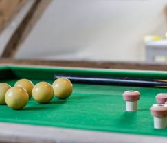 Das zweite Obergeschoss beherbergt unter den eindrucksvollen Holzbalken des alten Dachstuhls ein Schlafzimmer, ein Badezimmer und einen Unterhaltungsraum mit Billardtisch und Holzspielzeug.